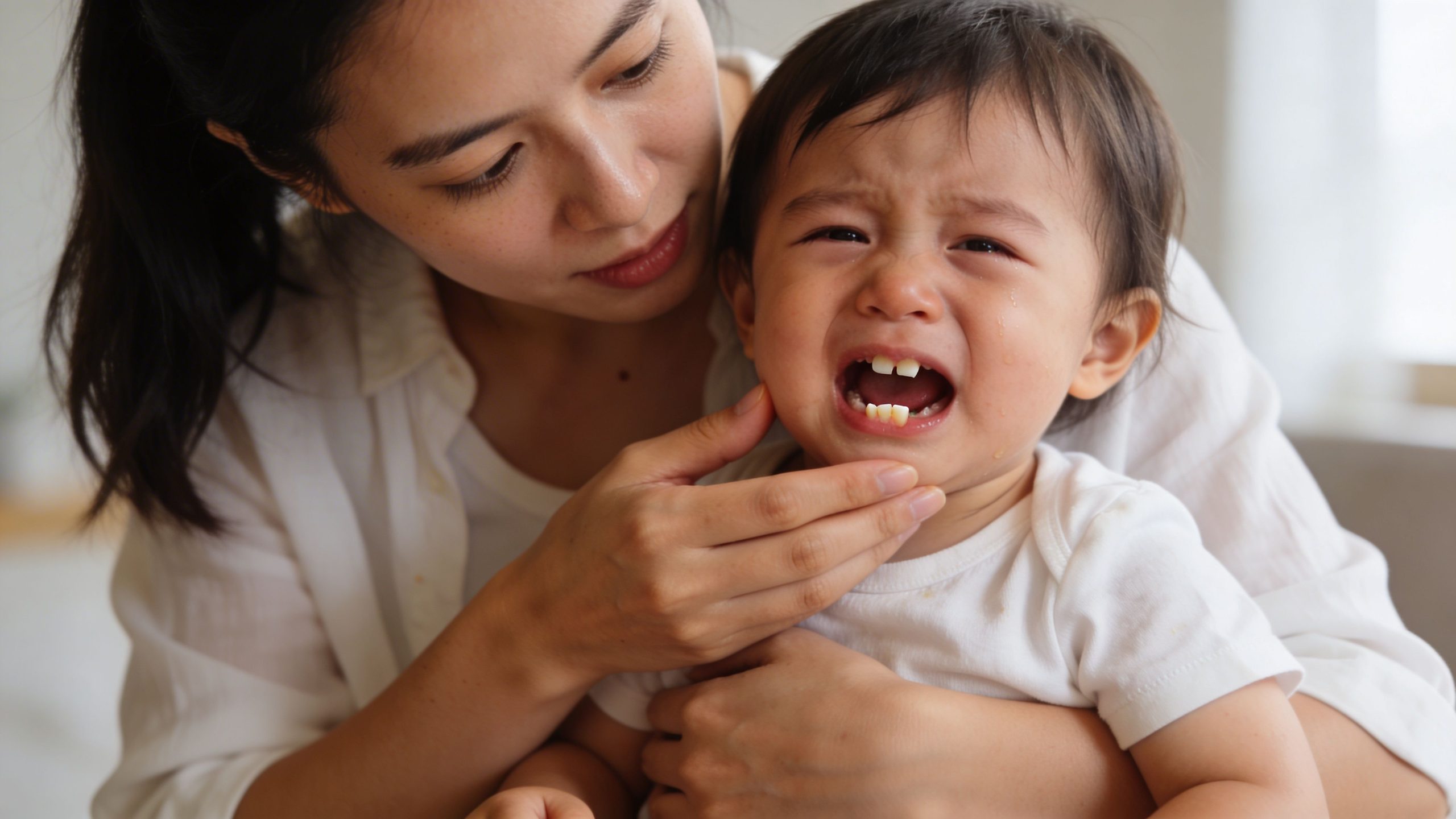 A concerned mother comforting her crying baby who has a visible chipped front tooth in home setting.